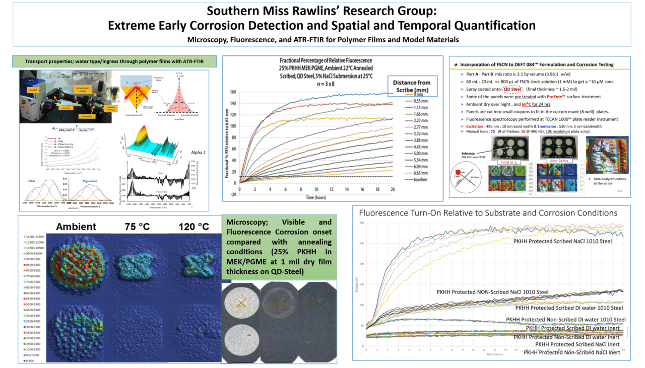 We have developed a reliable early corrosion detection and quantification characterization protocol that discerns between spatial and temporal metal dissolution rates for polymer coated substrates with/without intentional defects. Reflectance fluorescence detects and quantifies pH changes associated with corrosion onset and migration e.g., SAE 1010 steel and has been applied to oxygen, water, substrate, polymer variables with success in measurement within 24 hours. The adaptable approach includes electrolyte type and concentration, substrate composition and defect analysis from a variety of fluorescent indicators at low concentrations (0.002 wt. %, 10 µM) within a coating in a passive (more like nature) rather than active (EIS) manner. We propose to define the controlling variables for corrosion processes and corrosion prevention with our current emphasis on measuring differences between substrate preparation mode/methods, polymer type/structure/properties, application conditions, and cure/annealing processes, plasticizer and solvent effects on performance, and environmental conditions each individually.