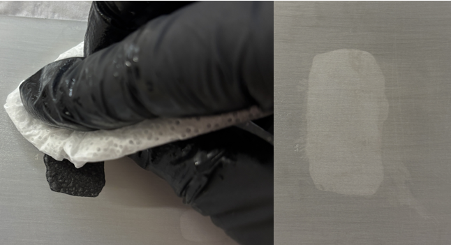 This process controllably applies a small amount of self-limiting chemical etchant. This etchant dissolves the coating and when it begins to etch/activate the aluminum the surface turns gray. The etchant is then wiped with a solution that absorbs the dissolved material while neutralizing any remaining active etchant material. The wipe is then disposed of, and the process is complete. There is no dust generation, no dripping liquid waste, no roughened surface risking dimensional tolerance.