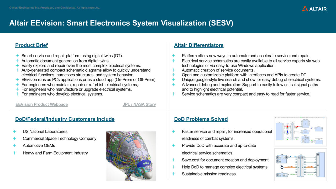 At Warner Robins AFB, Altair will present EEVision, a smart electrical system visualization tool designed to create interactive, digital-twin-based visualizations of electrical/electronic systems from legacy schematic data, including PDF-based Technical Orders. EEVision streamlines fault isolation, reduces downtime, and improves maintainability by eliminating manual schematic interpretation.