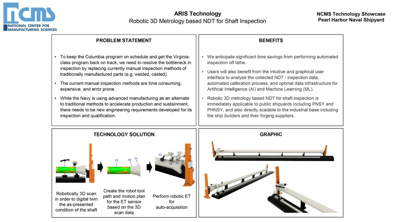 Using its technology platform, ARIS can rapidly integrate and test various vendor agnostic sensors, including 3D scanning, 2D vision, and NDT (Non-Destructive Testing). Our robotic systems can be configured to scale in size, ranging from a mobile pushcart for in-machine / in-process inspection to a large overhead gantry system to inspect an entire vehicle. For PHNS & IMF, a relevant system option would be a robotic NDT system for shaft inspection. ARIS is currently working with NAVSEA 05 to support modernization of requirements for auto-acquisition and accelerate adoption of robotic inspection systems at shipyards.