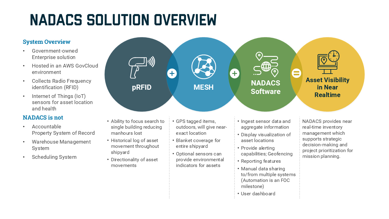 NADACS transforms connected logistics by implementing a flexible, near real-time system that provides asset location and condition details using wireless sensor mesh and pRFID devices to collect data.
