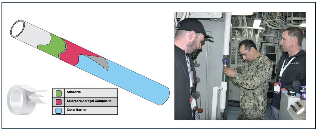 Current chill water pipe lagging is bulky and takes up valuable space on ships as well as a cumbersome installation process. Solarcore’s polyimide aerogel thermal management materials provide: